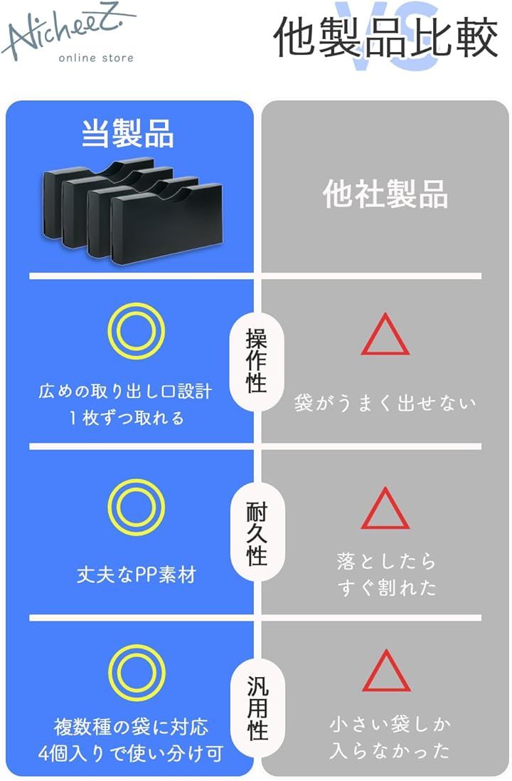 「ごちゃつく袋類をスッキリ整理」レジ袋・ポリ袋・ジップロックなど、かさばりやすい袋類をまとめて収納できるゴミ袋ストッカー4個セットです。