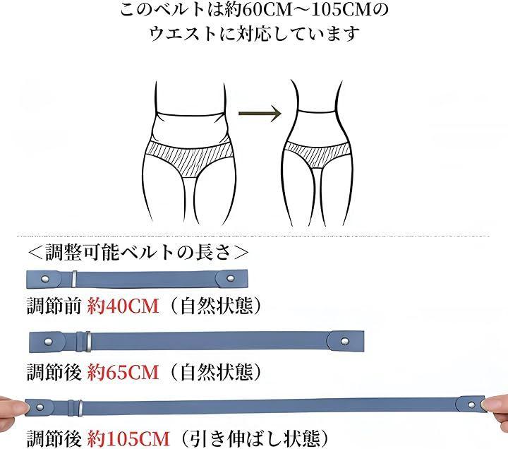 約40cm(自然状態)から最長105cmまで伸び、ウエストサイズに合わせて自由に調節できます。