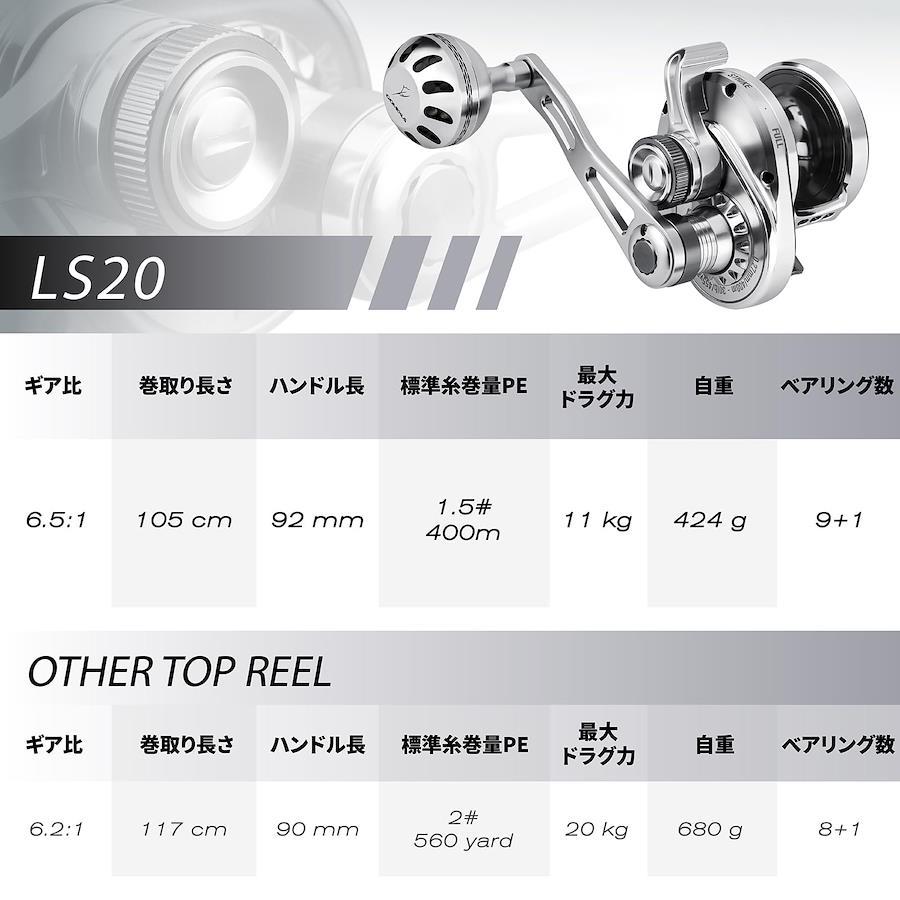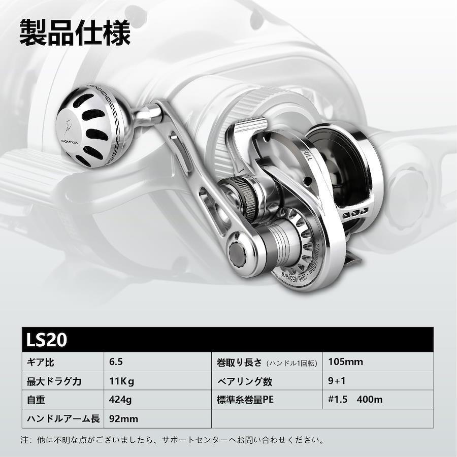【製品仕様】リール本体素材:アルミニウム+ステンレス鋼、本体重さ:424g、ギア比:6.5、最大ドラグ:11Kg、適用シーン:ショアジギング、船釣り【巻き心地】リール全体にベアリング十個を搭載され、巻き上げりの良い心地を確実する。超高強度真鍮ドライブギアを搭載し、タフさにも磨きを掛けます【強度頑丈】LS20ベイトリール本体はアルミ合金素材を採用し、リール全体剛性高くなり、オフショアジギングに適用パワーベイトリール【スロージギング】本リールのギア比は6.5で、スロージギングに最適巻きスピード、鉄板など重いルアーを巻く時は、ルアーを思いやりコントロールでき、快適巻き上げることができます。