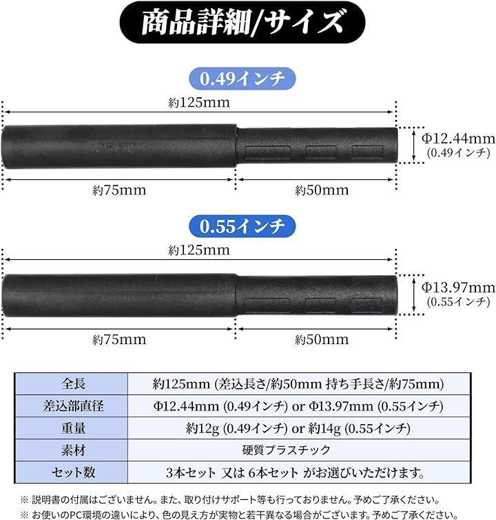 「ロッドサイズ」全長約125mm(差込長さ:約50mm、持ち手長さ:約75mm) 差込部直径:Φ12.44mm(0.49インチ)or Φ13.97mm(0.55インチ)「重量」約12g(0.49インチ) or 約14g(0.55インチ)