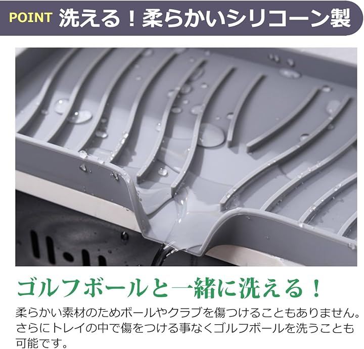 さらに、柔らかいシリコーン樹脂素材のトレイの中で傷をつける事なくゴルフボールを洗うことも可能です。