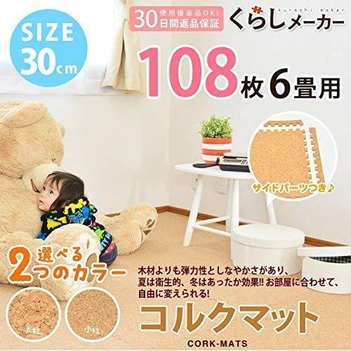 ■商品説明【セット内容】コルクマット108 枚 サイドパーツ付き コルクには上質な小粒タイプを使用し、弾力性・通気性に優れたマットとなっております。さらに、低ホルムアルデヒド仕様なので小さなお子様にも安心!クッション性も高く、転んでも怪我をしにくいので安心してお子様を遊ばせることが出来ますよ。 幅30x奥行30x厚み0.8cm(1枚) /重量:約7.5kg /素材:[表面]天然コルク 小粒 タイプ [裏面]:EVA樹脂 お子さまにも安心の低ホルムアルデヒド /・クッション性が高く、床へのキズ・衝撃防止に /・階下への防音対策 /・床の冷たさを防ぐ保温性 /・カッターやはさみで簡単に切れるのでレイアウト自由自在 /・汚れた時はさっと一拭き♪お手入れ簡単?もっと見るコルクマットは木材よりも弾力性としなやかさがあり、夏は衛生的、冬はあったか効果抜群!お部屋に合わせて、簡単・自由に変えられる!裏面はクッション性のあるEVA素材。音や振動を低減します 素材 コルク カラー 小粒/大粒 お手入れ方法 汚れた場合は、汚れたマットだけを取り外して、水で洗い流せます。洗い流した後は、必ず陰干しして乾燥させてください。 ※ご注意 ■マット関係の商品が発泡製法により、厚みの誤差が生じる場合がございます。予めご了承ください。 ■コルクマットの細かいタイプのコルクの部分が、 天然コルクを細かく砕いてから、コルクシートにしている為、多少の屑が出る場合がございます。予めご了承ください。 ■床暖房使用不可 ■やわらかい畳やカーペットの上では使用しないでください。 ■湿度によってコルクが伸縮しますので、お部屋に敷き詰める際は壁から少し隙間を空けてください。 ■表面のコルクが剥離しやすくなりますのでので、暖房機や直射日光などの熱を避けてください。 ■お部屋によっては、表記サイズと異なる場合がございますので、ご注文前には必ずお部屋のサイズを計測してください。 返品について お客様都合による返品はできませんので、お部屋のサイズをよく確認してから、ご注文ください。