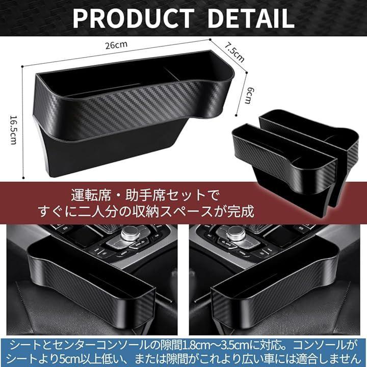 「商品詳細」セット内容:運転席側・助手席側2個セット サイズ(約):26cm x 7.5cm x 16.5cm、素材:ABS *本品はシートとセンターコンソールの隙間1.8cm~3.5cmに対応。
