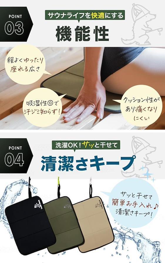 こんな方にオススメ。 サウナ室の熱さが気になる方 ・ 長時間座っても快適なマットが欲しい方 ・ 公共サウナで衛生的に楽しみたい方 ・ サウナグッズを持ち運びたい方 商品詳細 ・「素材」ネオプレーン ・「サイズ」広げた状態:横40cmx縦30cm / 畳んだ状態:横15cmx縦14cm ・「カラー」ブラック、カーキ、ベージュ