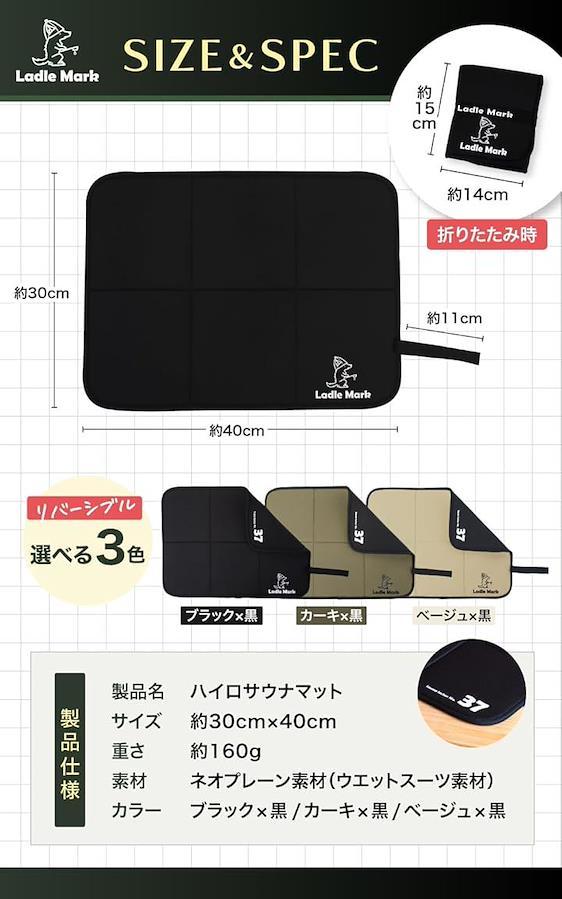 こんな方にオススメ。 サウナ室の熱さが気になる方 ・ 長時間座っても快適なマットが欲しい方 ・ 公共サウナで衛生的に楽しみたい方 ・ サウナグッズを持ち運びたい方 商品詳細 ・「素材」ネオプレーン ・「サイズ」広げた状態:横40cmx縦30cm / 畳んだ状態:横15cmx縦14cm ・「カラー」ブラック、カーキ、ベージュ