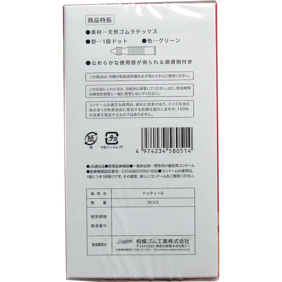 【注意事項】・この製品は、貼付文書を必ず読んでからご使用ください。・コンドームの使用は、1回限りです。・この包装にいれたまま、冷暗所に保管してください。また、防虫剤等の揮発性物質と一緒に保管しないでください。・コンドームの適正な使用は、避妊に効果があり、エイズを含む他の多くの性感染症に感染する危機を減少しますが、100%の効果を保証するものではありません。