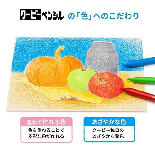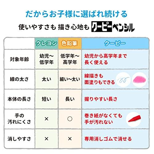 通常1-5営業日で発送:【18色】黄・山吹・橙・薄橙・茶・赤茶・黄土・朱・赤・桃・紫・水色・黄緑・緑・青・ねずみ色・黒・白/【特長1】折れにくい、消しやすい、削れる/軸全体が芯の色鉛筆(芯の容量:従来の色鉛筆の約4倍)/【特長2】色鉛筆の書きやすさとクレヨンの持つ発色を生かした新しいタイプの色鉛筆/【付属】クーピー消しゴム・クーピー削り器付き/【単品サイズ】Φ8×119mm/本/【ケースサイズ】179×215×15mm