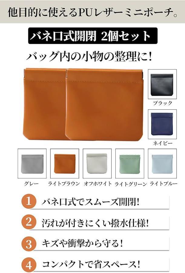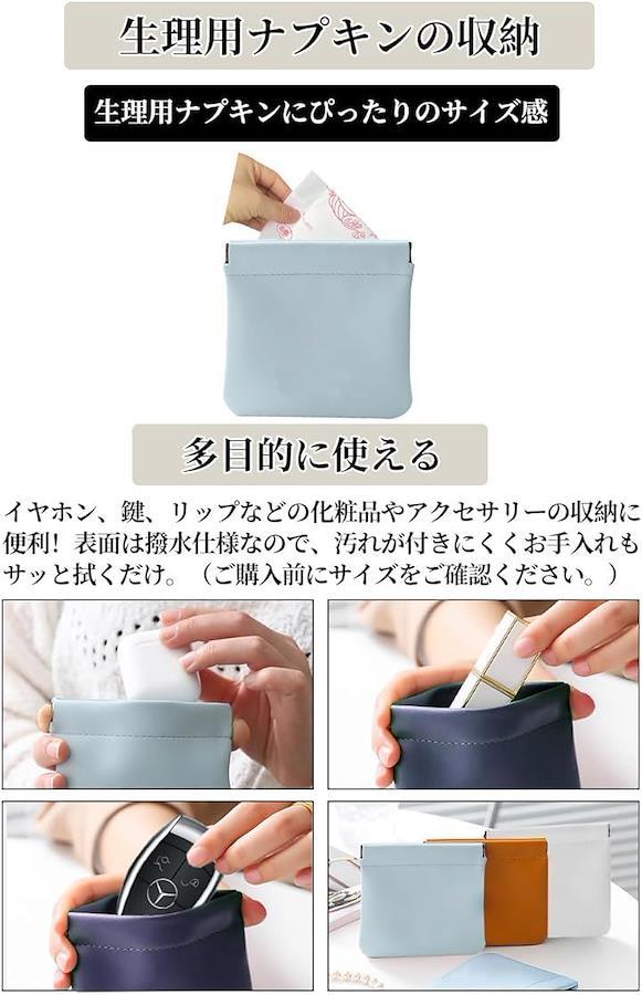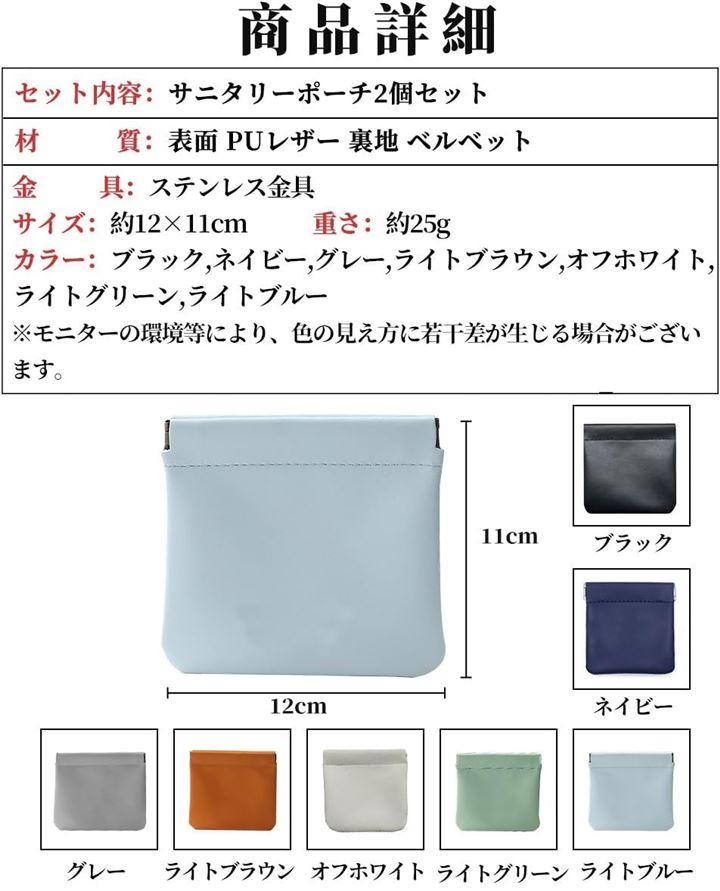 「商品仕様」セット内容:サニタリーポーチ2個セット 材質:表面 PUレザー 裏地 ベルベット 金具:ステンレス金具 サイズ:約12x11cm 重さ:約25g カラー:ブラック,ネイビー,グレー,ライトブラウン,オフホワイト,ライトグリーン,ライトブルー *モニターの環境等により、色の見え方に若干差が生じる場合がございます。