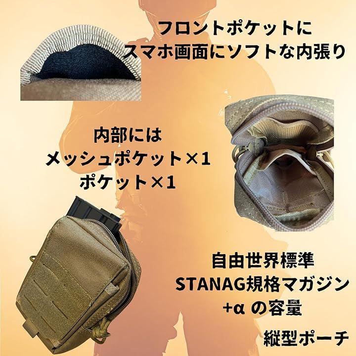 縦型のポーチはM-4シリーズのM-16 AR-15 陸上自衛隊20式小銃に使われているSTANAG規格のマガジン+αが入る容量でマガジンポーチ代わりにも molleシステムでガンベルトやリュックに装着しやすく仕立てました 内側にメッシュポケット ポケット各1 アウターのフラップ付きポケットは片面がスマホの画面に優しいソフト加工です