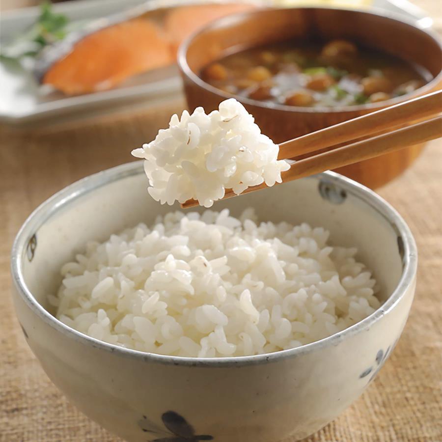 高アミロース米(白米の品種)、白米、大麦(大麦をみがいて、白米と同じ形、大きさをあわせて食べやすい食感)の3種をブレンドした炊飯パック米。カロリー35%オフ、糖質36%オフ、1食あたり食物繊維4.2g。※日本食品標準分析表 2015年度版(七訂)精白米との比較。電子レンジで約2分、お湯で約10分簡単調理。