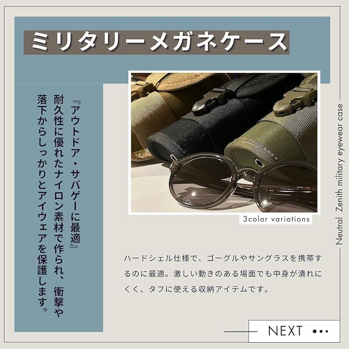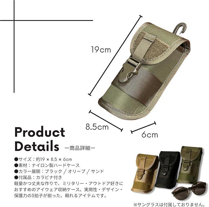「商品詳細」 *サイズ:約19 x 8.5 x 6cm *素材:ナイロン製ハードケース *カラー展開:ブラック / オリーブ / サンド *付属品:カラビナ付き 軽量かつ丈夫な作りで、ミリタリー・アウトドア好きにおすすめのアイウェア収納ケース。