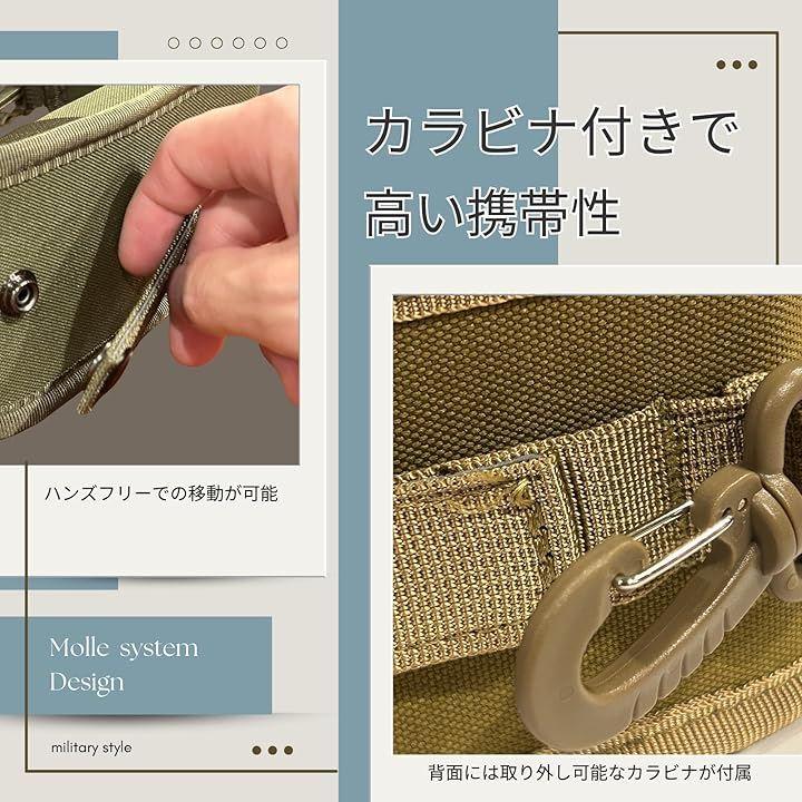 「カラビナ付きで高い携帯性」 背面には取り外し可能なカラビナが付属しており、ベルトループやモールシステム付きベスト、リュックなどに簡単に装着可能。