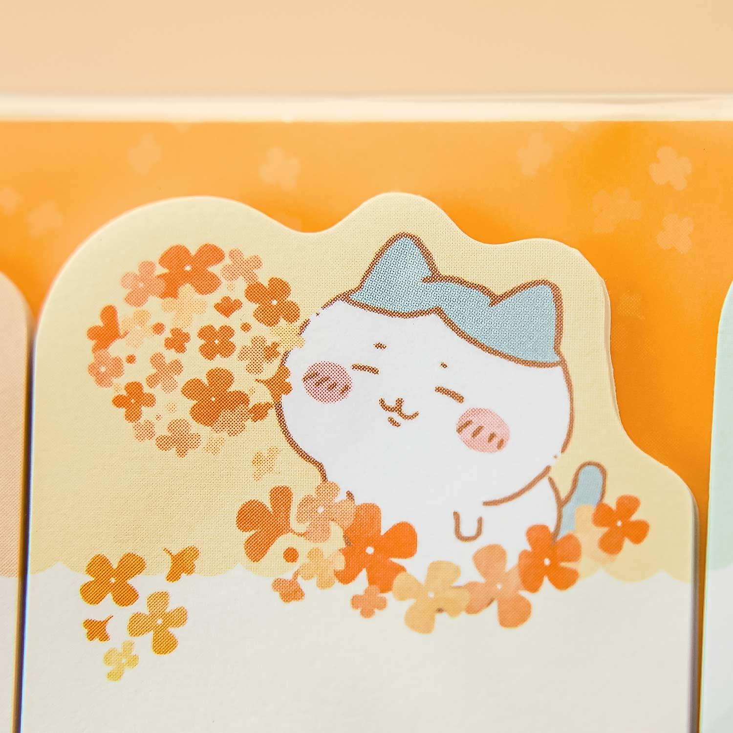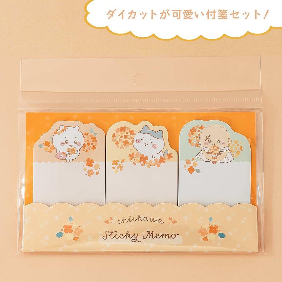 ちいかわの秋は金木犀を添えてダイカット付箋ダイカットの付箋が3つ並んだカワイイ仕様の、「ダイカット付箋」。 柄は、ちいかわ。 カラーは、オレンジ。キャラクターは、ちいかわ・ハチワレ・ラッコ。ちいかわトータルステーショナリー第8弾は「フレグランスオリーブ」。 「フレグランスオリーブ」=金木犀。秋にピッタリなトレンド感あるデザインシリーズです!ちいかわ達の日常を切り取ったようなシーンや、グラデーションがかったおしゃれな水彩タッチの商品が特徴です。
