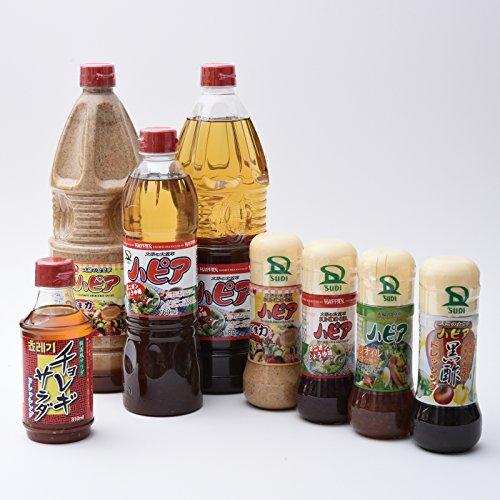食用植物油脂、醸造酢、砂糖、醤油、玉ねぎ、ごま油、食塩、にぼし、ブドウ糖、オリーブ、レーズン、にんにく、ビタミンC、ホタテ、はちみつ、香辛料、調味料(アミノ酸等)、増粘多糖類、(原材料の一部に小麦・大豆を含む)