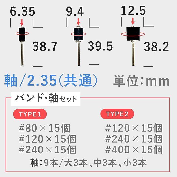 サンディング バンド ドラム 研磨 サンドペーパー ルーター ヤスリ 120 240 400 番手 各15個 軸 2.35mm 各3本