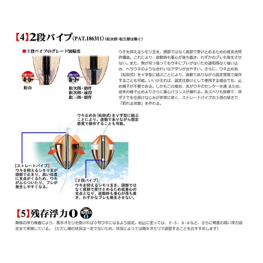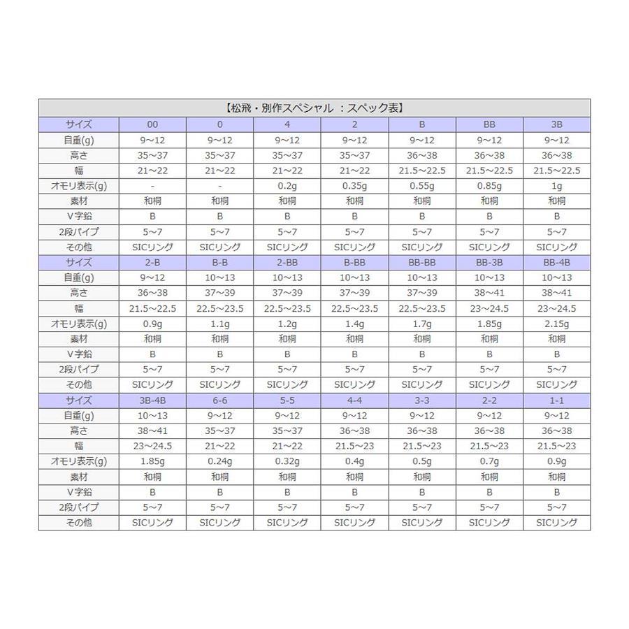 別作・松飛をベースとした特別仕様モデル!よりシェイプに磨きをかけ、シビアなグレにも対応するステルスカラーモデルです。現行モデルよりも小さく仕上げることで、ウキの抵抗を最小限に抑え、わずかなアタリも感知します。小さいボディでありながら、遠投性(松三郎 II 対比約1.4倍)があり、本来の性能も維持したスペシャルモデルです。