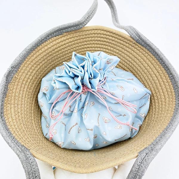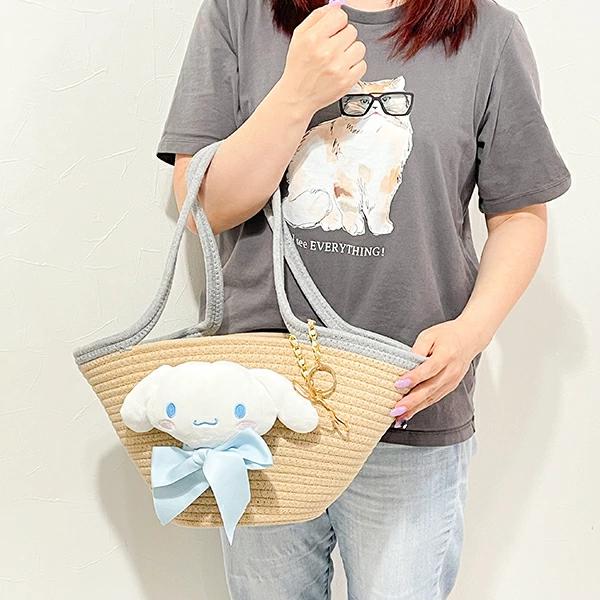存在感抜群なシナモロールの可愛いぬいぐるみが付いたかごバッグです。大きいリボンがポイント♪フェイス型のチャーム付きが嬉しい~☆巾着が付いているので、中身の目隠しができるので安心してお使いいただけます!巾着のデザインも可愛すぎます♪置いておくだけでも可愛いのでお部屋のインテリアとして、ぬいぐるみなどを収納するのもおすすめです☆彡【巾着サイズ:440×270×マチ130mm】