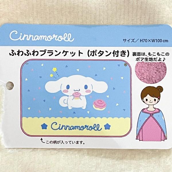 シナモロールのふわふわブランケットです。裏面がボア生地になっていてふわふわであったかい♪冷えやすい足元はもちろん、ボタン付きなので肩にかけてもズレずに◎可愛いデザインなのでお仕事も頑張れそうです☆彡