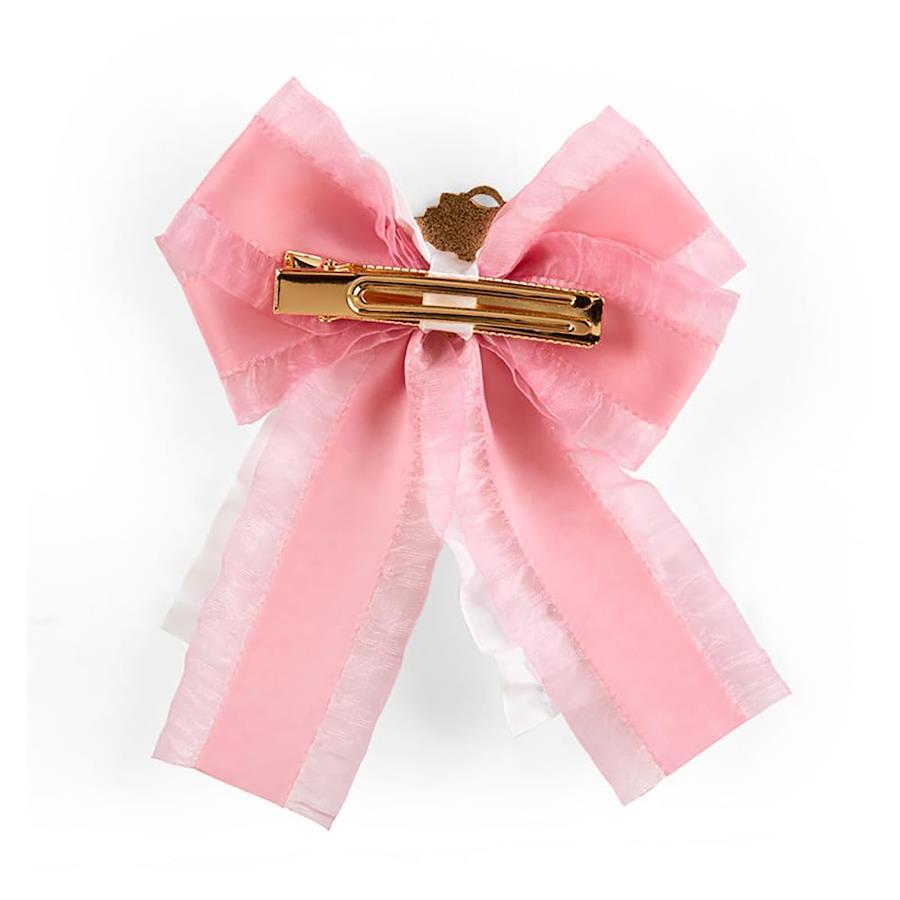 フリル付きリボンがおしゃれなヘアクリップ。カメオ風チャームと揺れるいちご形チャーム付き