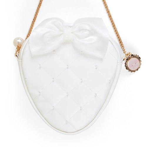 スマートフォンやハンカチなどの小物が入るサイズの白いちごの形をしたミニポシェット。合皮のキルティングにパールが付いた豪華なデザイン。内側はトワルドジュイ風の総柄プリント入り。マイメロディのプリントが入ったキャストチャーム付き。