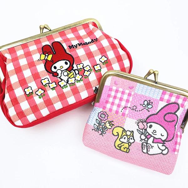 マイメロディの畳刺繍ペンポーチです。横幅が広いので中身が取り出しやすい便利ながま口タイプ♪マチと大きく開くがま口で中身を出し入れしやすい!中には内ポケットがあるので細かいものを分けて収納できて便利に使えます☆