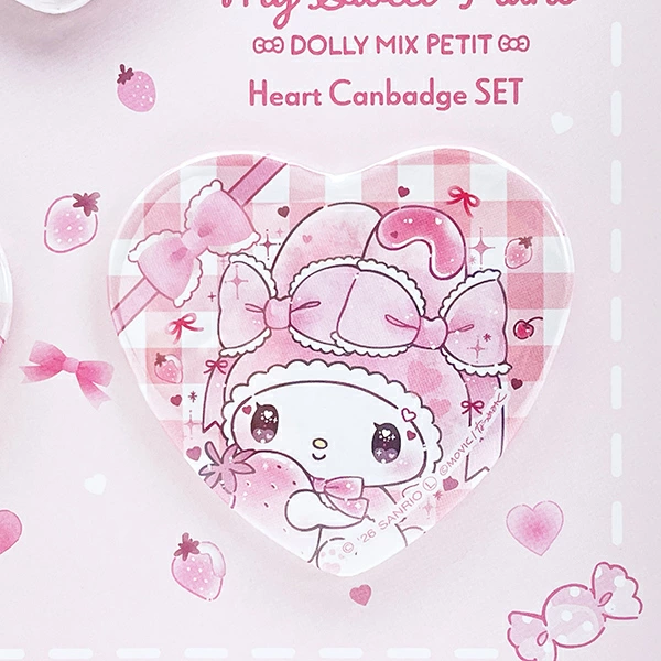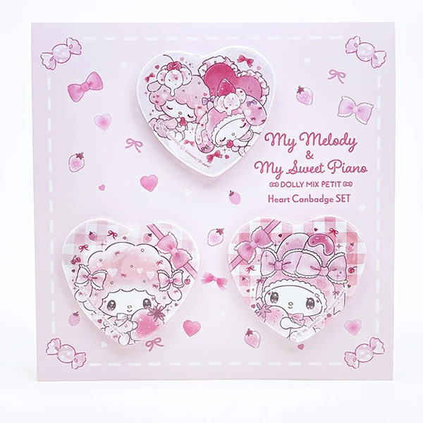 マイメロディ&マイスウィートピアノのハート缶バッジ3個セット!キラキラホログラム仕様でとってもかわいい♪