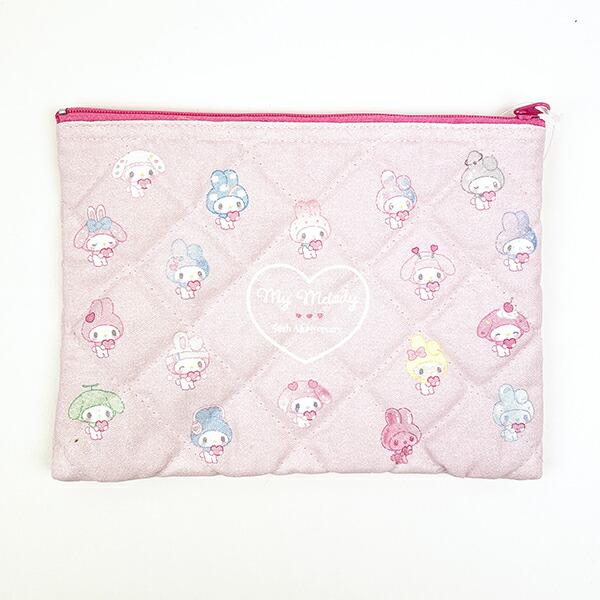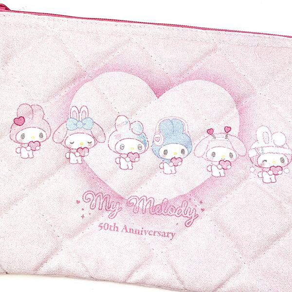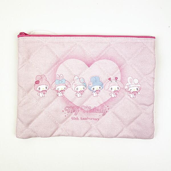 マイメロディの50周年デザインのキルティングポーチです。もこもこなキルティング生地とファスナーの色がアクセントになっています☆ガーリーでポップなマイメロちゃんデザインが可愛い♪ぜひ周年のお祝いにいかがですか?