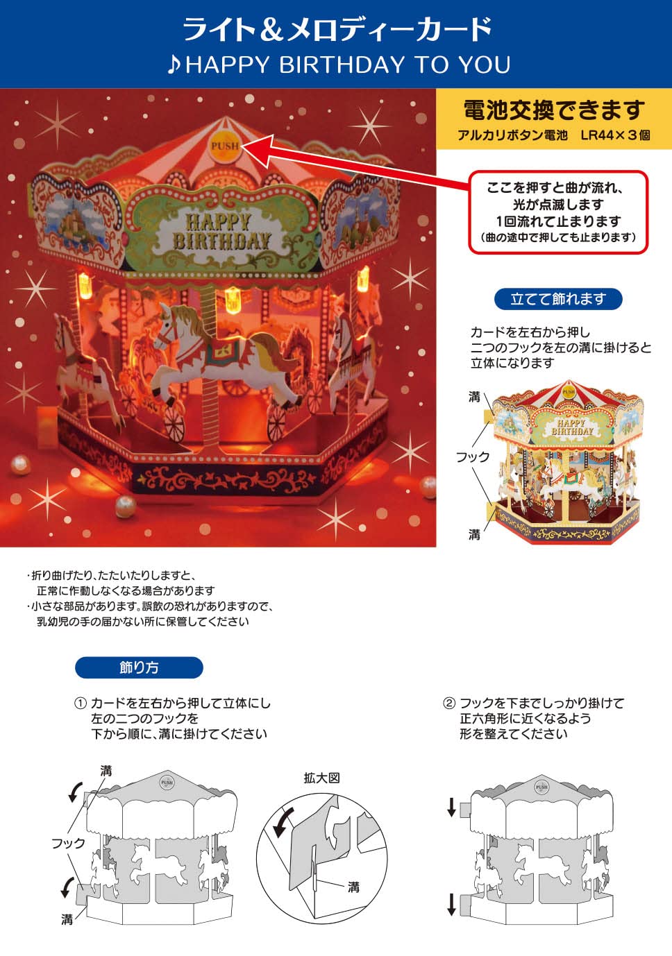 ・飾ったサイズ:13.5x15x12cm 立体ライト&メロディーカード ・カードを前後に開いてフックを掛けると、六角形の立体になり立てて飾れます。ボタンを押すと、「HAPPY BIRTHDAY TO YOU」の曲に合わせて、赤とオレンジ色の光が点滅し、ふんだんに施された金箔加工に反射して、とてもきれいです。カードの裏側にメッセージスペースがあります。光った静止画はイメージです。 ・電池交換できます。 ・郵便料金(国内)は140円です。海外にも郵送できます(海外にお送りする際は、郵便局で料金をお確かめください)。 ・? 2021 SANRIO CO., LTD.