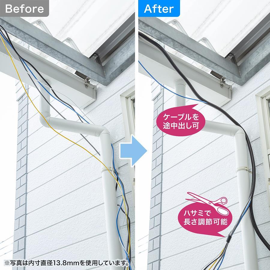 ●ケーブル配線をまとめて、すっきりできます。●背割れタイプで、スリットからケーブル両端を必要な位置から出すことができます。■カラー:ブラック■長さ:2m■直径:外寸/14m、内寸/10.7mm■ケーブル収容数:2※ケーブル収容数は、直径5~6mmのLAN(UTP)ケーブルを収容した場合の目安です。■材質:PP(ポリプロピレン)■耐熱温度:-20℃~70℃■入数:1個