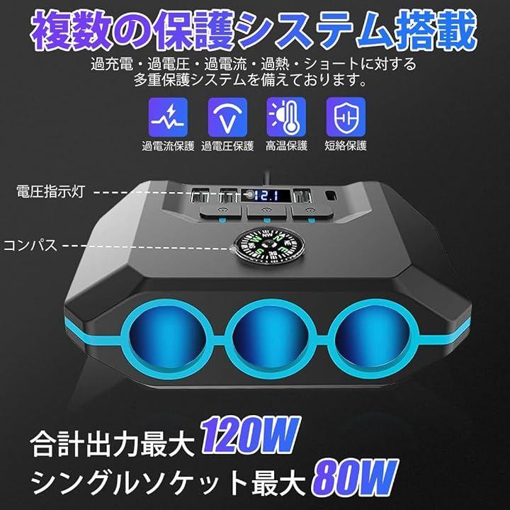 「シガーソケット3連増設・USBポート4口搭載」シガーソケットは、3連シガーソケットは合計輸出功率は120Wに拡大します。