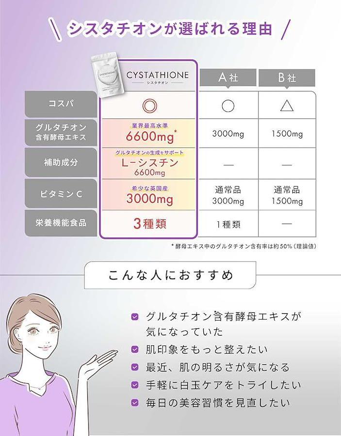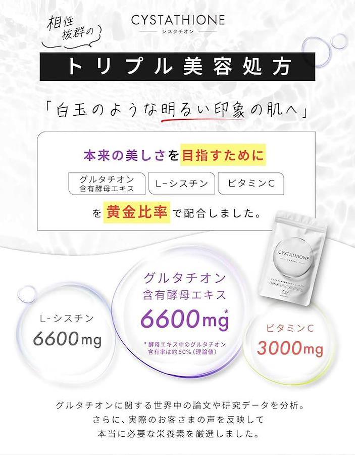 「トリプル美容処方」 シスタチオンは、ワンランク上の白玉美容を目指して、グルタチオン含有酵母エキス、C-シスチン、ビタミンCを黄金比率で配合した日本製サプリメントです。