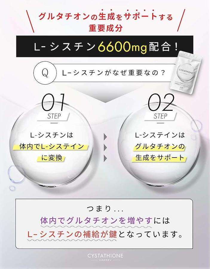 「補助成分L-シスチンもたっぷり配合」グルタチオンの重要成分であるシステインを供給するためにL-シスチンを6,600mg配合。