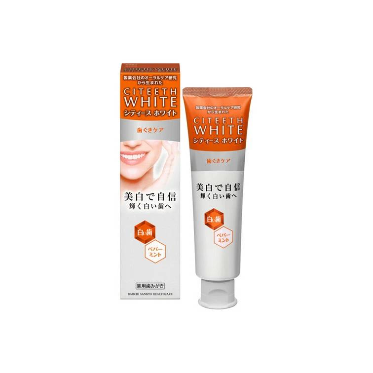 【シティースホワイト 歯ぐきケアの商品詳細】●製薬会社のオーラルケア研究から生まれた美白(*1)高機能歯みがきシリーズ 美白(*1)で自信 輝く白い歯へ●シティースホワイトの3ステップ美白(*1)(1) 「浮かせて落とす」トリプルステインオフ処方(*2)でステイン(着色汚れ)を浮かせて落とす。(2) 「きれいに清掃」微粒子クリーニング成分β-TCPが細かい汚れや歯垢を落とし白い歯に。(3) 「強くなめらかに」再石灰化を促進し歯の表面を強くなめらかに。むし歯を予防。●イソプロピルメチルフェノール配合。歯周病が気になる方におすすめです。●【販売名】DSペーストPa*1. 美白:その人の歯本来の白さに近づけること *2. ヤニ除去成分3種配合(ポリリン酸ナトリウム、PEG-8、ポリビニルピロリドン)