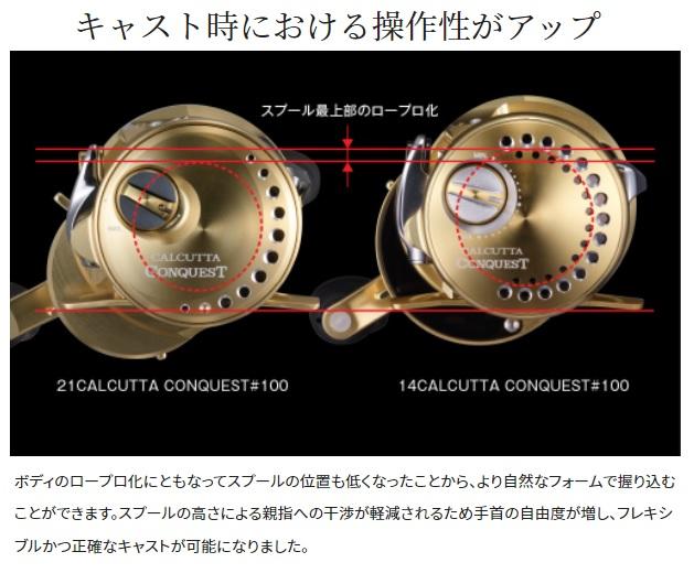 パワーで圧倒せよ。巻きにこだわる円形リールの旗手。金属ボディがもたらす、剛性感溢れる巻きごこち。カルカッタコンクエストは、ソルト用ベイトリールで評価の高いインフィニティドライブをバスリールとして初めて搭載。回転抵抗が大幅に軽減され、巻き上げの感度、パワー、フィーリングともに大きく向上しました。ボディをロープロ化することによりパーミング性がアップ。低慣性の、マグナムライトスプール3を新たに採用し、ストラクチャーの奥へ低い弾道でルアーを送り込むことが可能です。ギア比7.5、最大巻き上げ長89cmのXGがラインナップに加わり、パワフルかつハイスピードな巻き上げを可能にしています。 ギア比:7.5 最大ドラグ力:6kg 自重:235g スプール径/幅:38mm/21mm 糸巻量ナイロン(lb-m):12-165、14-145、16-120、20-100 最大巻上長:89cm/ハンドル1回転 ハンドル長さ:45mm ベアリング数BB/ローラー:13/1 夢屋ハンドルノブタイプ:A 夢屋ハンドルタイプ:BH-1 ※実物と色が違って見える場合があります。あらかじめご了承下さい。