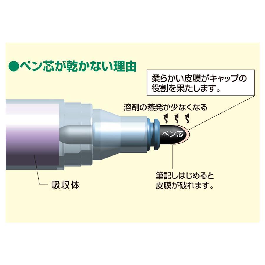 キャップをしめ忘れても、ペン芯が約3日間乾きません。らくらくインキ補充&ペン芯交換で、繰り返し使える経済的な1本! 乾きに強く、ニオイを抑えたアルコール系の特殊インキを採用。長時間筆記が可能で、キャップをしめ忘れても約3日間は乾きません。インキ補充とペン芯交換で繰り返し使えるので、資源の節約にも役立ちます。ペン芯にはホワイトボードの表面が傷つきにくいポリエステル繊維を使用しています。
