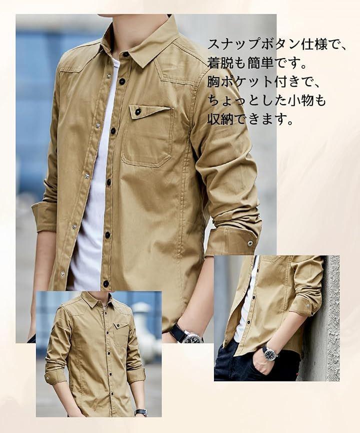 シャツ メンズ 長袖 カジュアル コットン 無地 スナップボタン 綿100 春秋