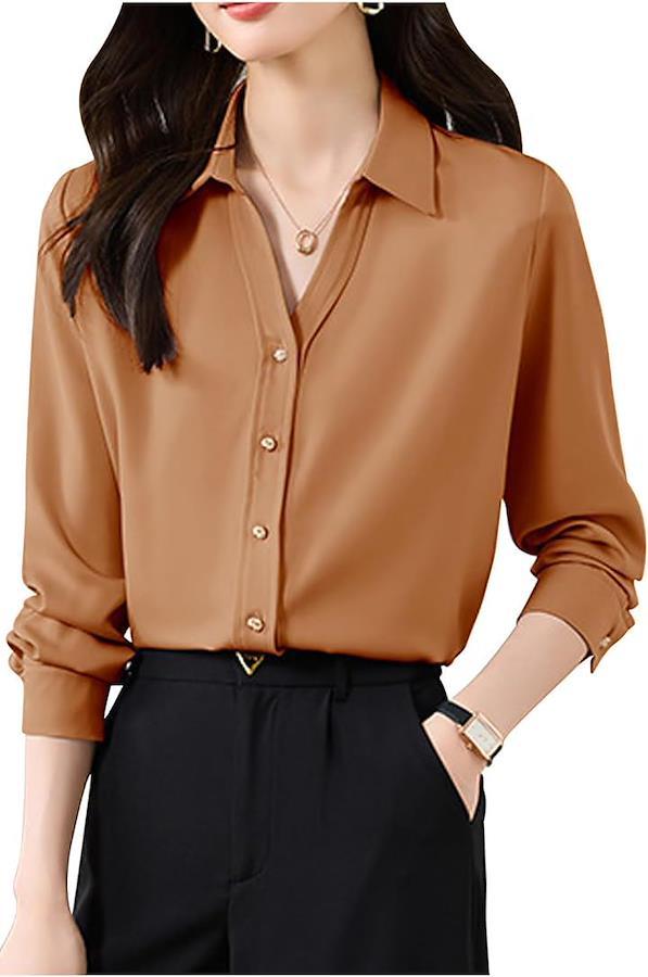「好印象&オシャレを叶えるスキッパーデザインのブラウス」エレガントですっきりとしたVネックデザインにビジューボタンがアクセントになった、お洒落な長袖シャツです。