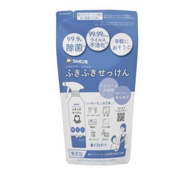 製品の特徴「石けん系」の拭き取り式マルチクリーナー! ”ふきふきせっけんバブルガード”は毎日の気になる汚れをスッキリ落としながら除菌(※1)、さらにウイルスを99.99%以上不活化(※2)します。もちろん、殺菌剤・アルコール・香料・着色料・酸化防止剤・合成界面活性剤不使用の無添加石けん。お子さまから大人まで安心して使用できます。アルコールに限らず除菌スプレーで拭き取りを行う際、拭き残しや周囲への食品へかかってしまう恐れもあり、何より手に触れるもの。除菌やウイルス対策だけではなく手肌へのやさしさも大切にしませんか?※1 すべての菌を除菌するわけではありません。※2 すべてのウイルスを不活化するわけではありません。