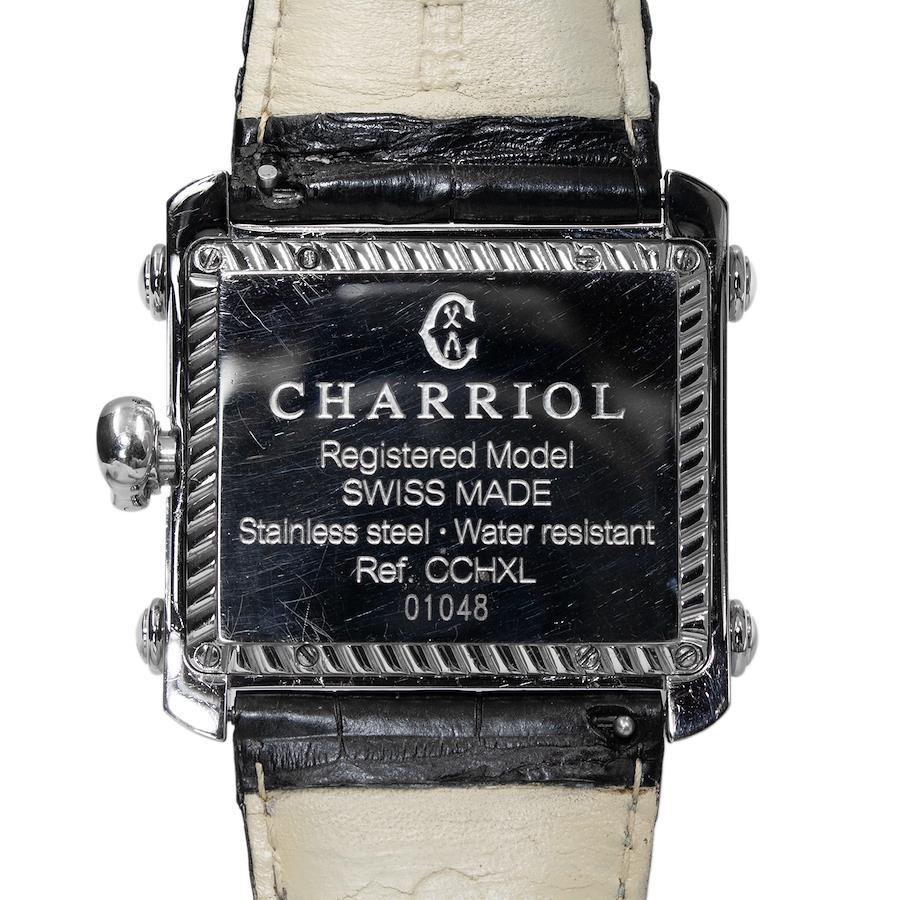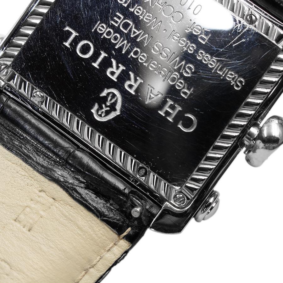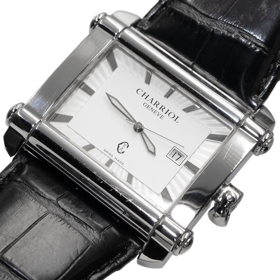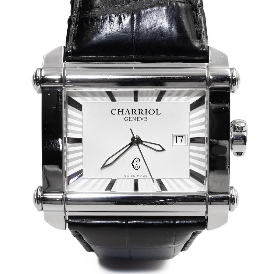 こちらは力強いレクタンギュラーケースが知的な印象を与える、シャリオールの腕時計でございます。