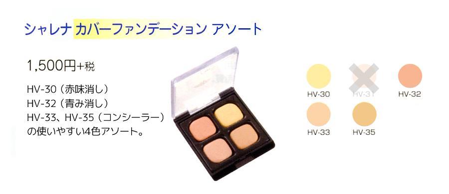シャレナカバーファンデーションの使いやすい4色アソート。HV-30(赤味消し)HV-32(青み消し)HV-33,HV-35(コンシーラー) 混ぜてお使いいただけますので、様々な用途でお使いいただけます。保湿成分やメラニンを抑制する成分が配合されていますので、素肌をより美しくするスキンケア効果も期待できます。紫外線防止剤(UV-A UV-B)配合それぞれ単品の製品もございます。(全5色、2,100円)内容成分〈HV-30〉トリエチルヘキサノイン・ヘキサ(ヒドロキシステアリン酸/ステアリン酸/ロジン酸)ジペンタエリスリチル・ジエチルヘキサン酸ネオペンチルグリコール・セレシン・ジメチコン・パルミチン酸デキストリン・合成ワックス・セスキオレイン酸ソルビタン・ラウロイルグルタミン酸ジ(フィトステリル/オクチルドデシル)・カルナウバロウ・ジメチルシリル化シリカ・トコフェロール・水酸化Al・アルミナ・酸化チタン・マイカ・酸化鉄・タルク〈HV-30以外、全色共通〉トリエチルヘキサノイン・ヘキサ(ヒドロキシステアリン酸/ステアリン酸/ロジン酸)ジペンタエリスリチル・ジエチルヘキサン酸ネオペンチルグリコール・セレシン・ジメチコン・合成ワックス・セスキオレイン酸ソルビタン・ラウロイルグルタミン酸ジ(フィトステリル/オクチルドデシル)・カルナウバロウ・トコフェロール・水酸化Al・アルミナ・「+/-」・酸化チタン・マイカ・酸化鉄・タルク【メーカー】 株式会社 三善【区分】日本製 化粧品【広告文責】株式会社グローバル通販、連絡先:0120-34-3728