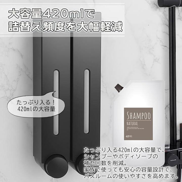 「大容量420mlで詰替え頻度を大幅軽減」たっぷり入る420mlの大容量で、シャンプーやボディソープの補充回数を削減。