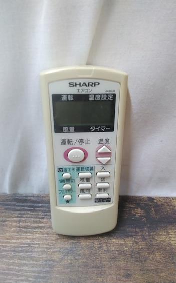 中古品です。単4電池2本必要です。通電確認済です。エアコンリモコン本体に汚れ、キズ、色あせ、スレがあります。シャープのエアコンリモコン、「A486JB」です。