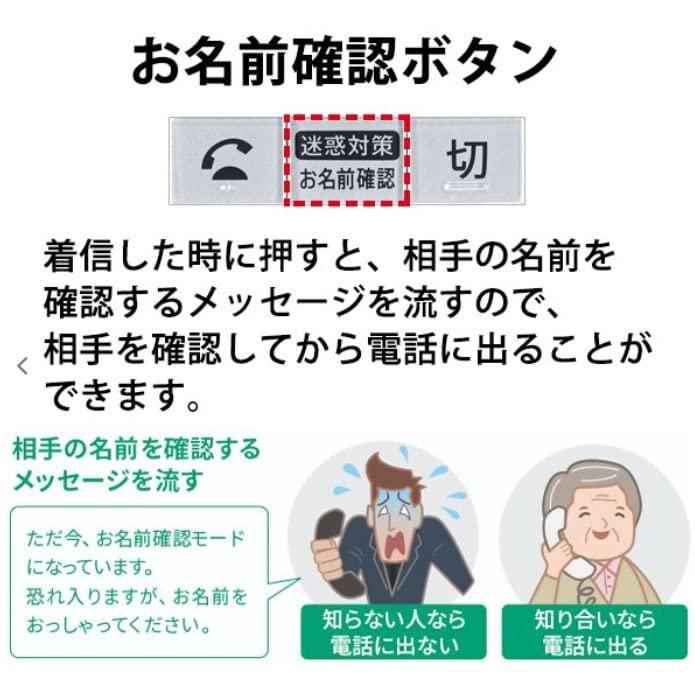 ワンタッチ操作で気軽に『アポ電』対策などが行える「お名前確認ボタン」を搭載 電話に出る前に音声メッセージを流して相手の名前を確認できる「お名前確認ボタン」を搭載し、ワンタッチ操作で気軽に『アポ電』などの迷惑電話対策が可能