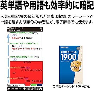 色名 -W(ホワイト系) 画面 5.5型WVGA+カラー液晶(854 × 480ドット、横121.1mm × 縦68.0mm) タッチパネル対応 外形寸法 閉時・最薄部・突起部含まず幅152.4mm × 奥行94.5mm × 高さ17.9mm 閉時・突起部含む幅152.4mm × 奥行94.5mm × 高さ18.4mm 質量 約260g(充電池・タッチペン含む) 本体ユーザーエリア 約200MB 電源 リチウムイオン充電池※1 使用時間 約140時間※2 付属品 タッチペン・microUSBケーブル・ACアダプター※3 ※1付属のACアダプター・microUSBケーブルを使用して充電できます。※お客様による交換はできません。 ※2カード非装着、使用温度25℃で連続表示した場合(表示の明るさ3で、表示状態になった30秒後に表示が暗くなる場合)。また、使用温度25℃で英和辞典で1秒1キー操作で“dictionary"と入力して英和訳画面を表示し、これを5分間繰り返した後に連続表示を55分間行った場合は約70時間。 ※3ACアダプターは日本国内仕様ですが、AC100~240V(50/60Hz)に対応しております。