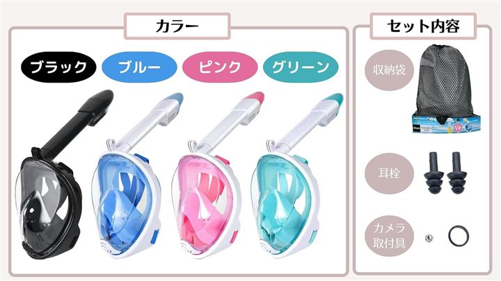「セット内容」シュノーケルマスク+収納袋+耳栓+カメラ取付部品「カラー」ブラック/グリーン/ブルー/ピンク「サイズ」XS(小さいお子様)、S/M(大きいお子様~大人女性)「機能・特徴」フルフェイス/180°広角視野/大型レンズ/曇り止め/浸水防止/カメラ取付可能