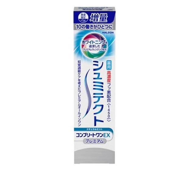 製品の特徴●シュミテクト コンプリートワンEX プレミアム ナチュラルミント●薬用ハミガキ●知覚過敏で歯がシミるのを防ぐとともに、ホワイトニング、歯周病予防、ムシ歯予防など 10の働きがひとつになったオールインワンハミガキ。●ホワイトニングを追求したプレミアムクレンジング処方。●知覚過敏の歯を傷つけにくく、しっかりホワイトニングするために開発した独自の低研磨(※)な処方を採用。(※同社シュミテクト内)●薬用高濃度フッ素配合<1450ppm>●ナチュラルミントフレーバー。●医薬部外品●販売名:シュミテクトzsf●歯磨き粉歯みがき粉