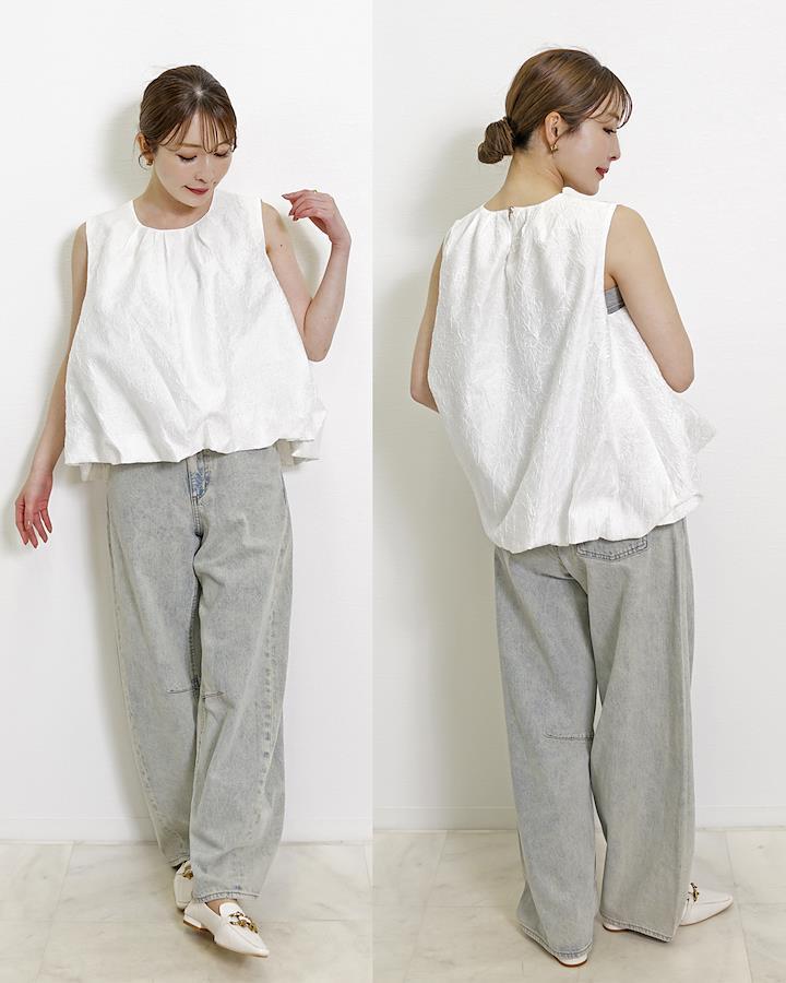 シュリンクワッシャー加工素材を使用した、ヘムバルーンブラウスです。