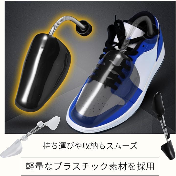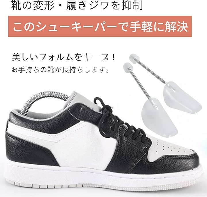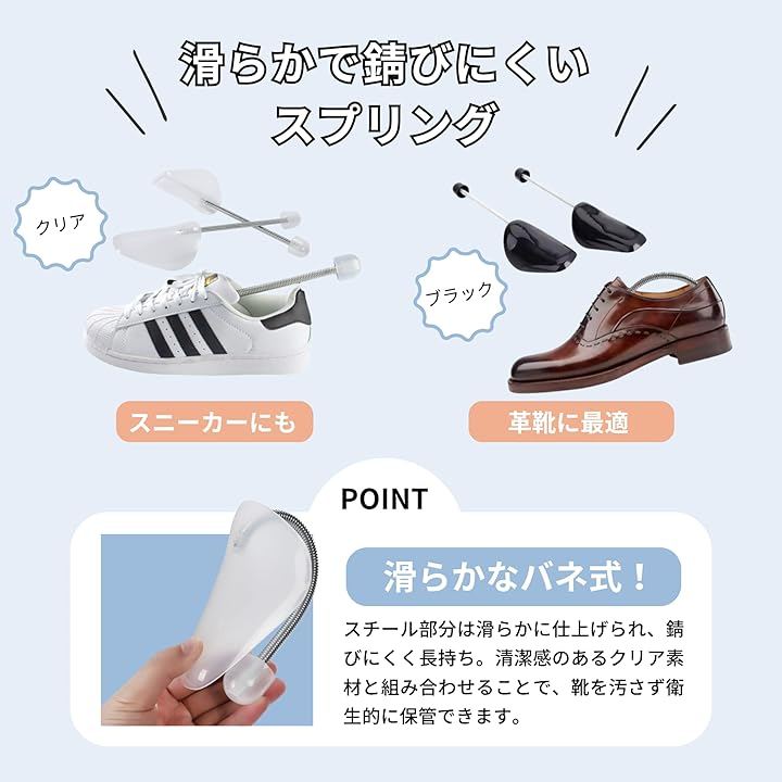 「商品詳細」 サイズ:フリーサイズ(目安:約33cmx9.5cm) 素材:軽量プラスチック、スチールスプリング カラー:クリア / ブラック セット内容:2足分(4個入り) 用途:スニーカー、革靴、ローファー、ビジネスシューズなど 特徴:滑らかで錆びにくいスプリング構造/高反発でしなやかなフィット感/靴の型崩れ・履きジワ防止