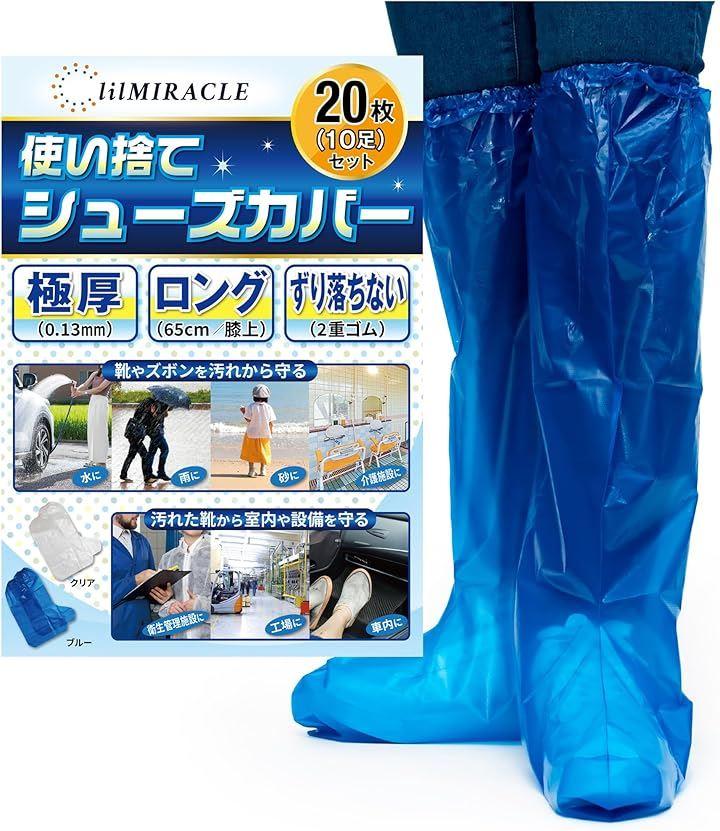 ・v「商品仕様」使い捨てシューズカバー(極厚・超長・ずり落ちない) 男女兼用 フリーサイズ 厚み:0.13mm 底長:38.5cm 高さ:65cm 履き口:2重ゴム 重量:約50g/2枚(1足) カラー:ブルー(青) 内容量:20枚(10足)*一般的な厚底ではないスニーカーで、靴の底面の長さが32cm程度まで着用可能です。