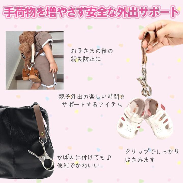 「手荷物を増やさず外出サポート」このベビーカー用のシューズクリップは、子どもの靴だけでなくカバンなどの小物をしっかり固定するため、落下や紛失のリスクを軽減します。